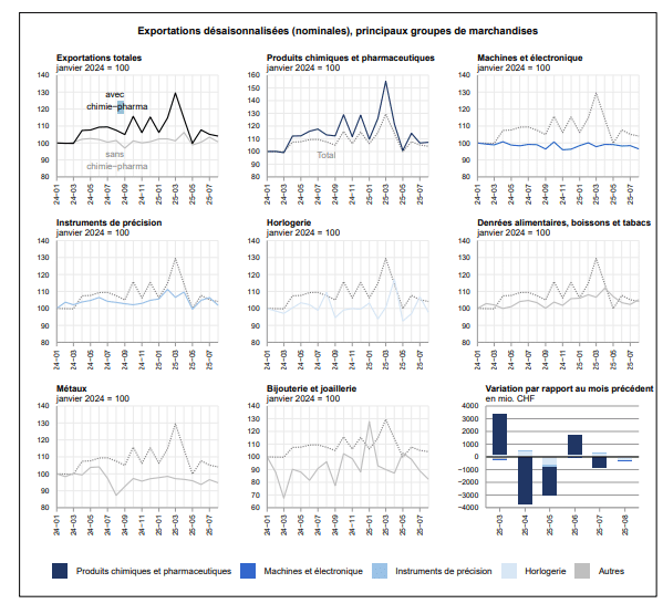 Après leur revers du mois précédent, les exportations désaisonnalisées se sont également contractées en août 2025 (-1,0%). Si sous l’angle géographique, les exportations vers les USA ont plombé le résultat, les ventes horlogères ont particulièrement souffert au niveau des groupes de marchandises. Les importations ont légèrement progressé (+0,4%). Au final, la balance commerciale enregistre un excédent moindre à 3,9 milliards de francs.